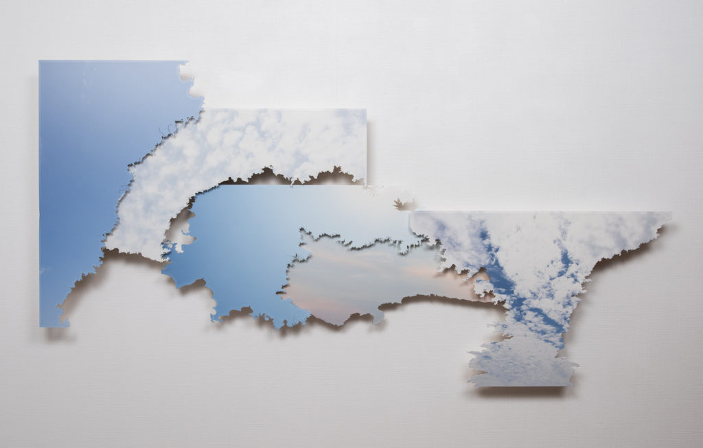 I walk through the city conducting research, capturing images of the distinctive landscapes, printing them on Japanese paper, cutting out the subjects, and layering them with photographs of the sky that served as the background. This piece expresses the city through the cut-out space and the sky.